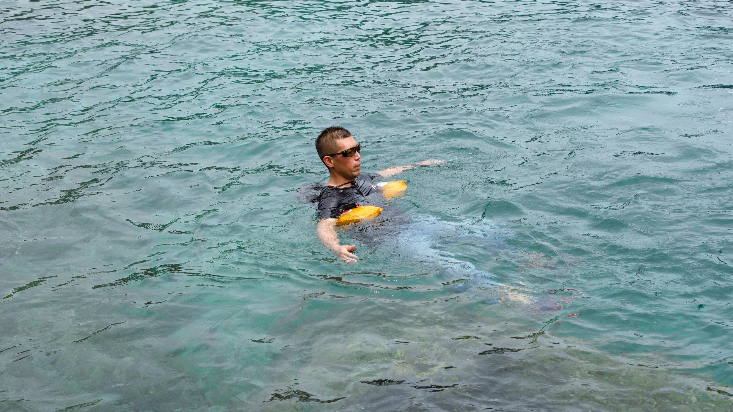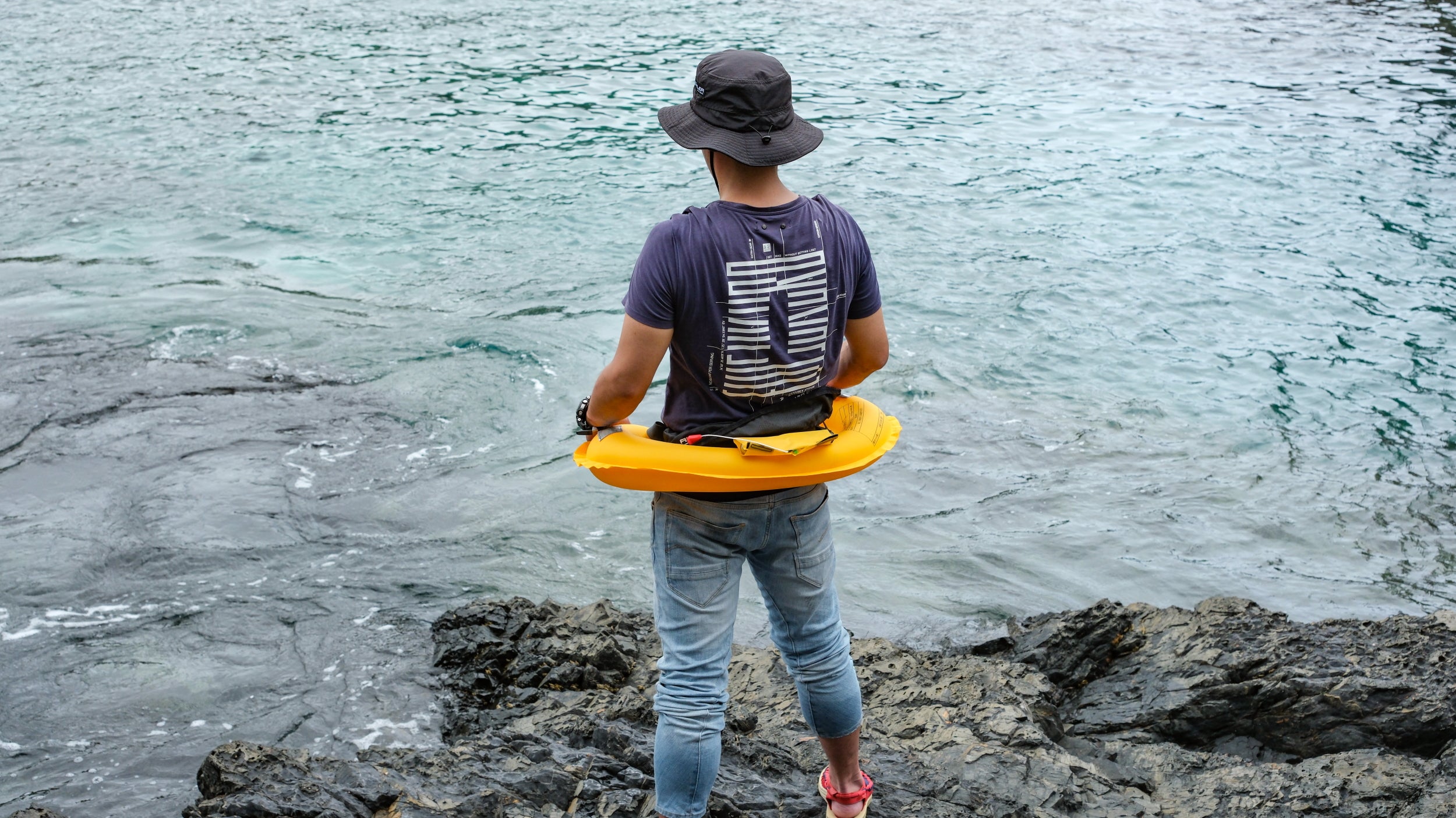 膨脹後のフロートは写真のように浮き輪状に展開し、着用者の腰回りを包み込むことで水中でも安定した浮遊姿勢を保ちやすい構造になっています。