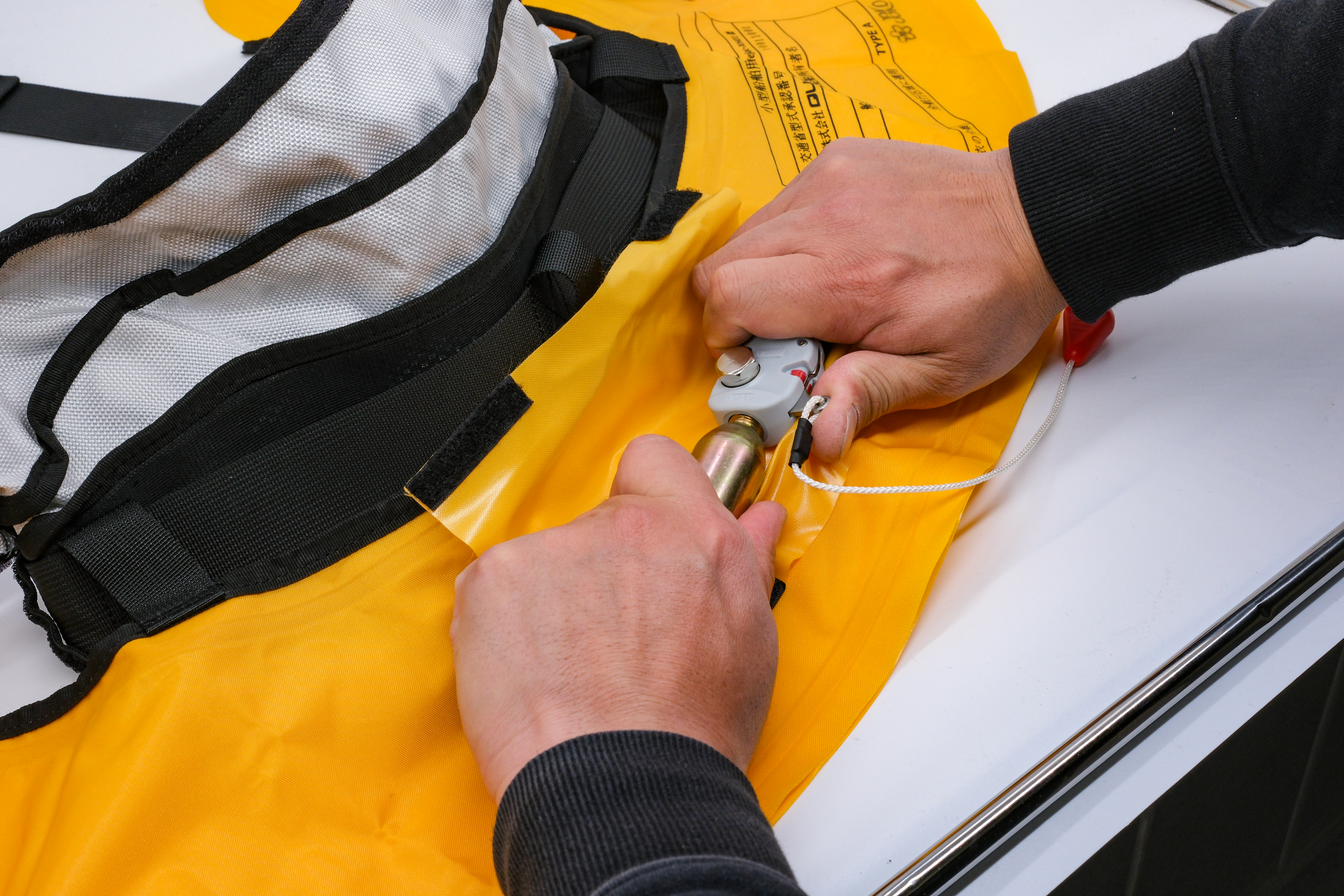 ライフジャケットが膨脹した後は、安全に再使用するため必ずボンベの交換を行ってください。